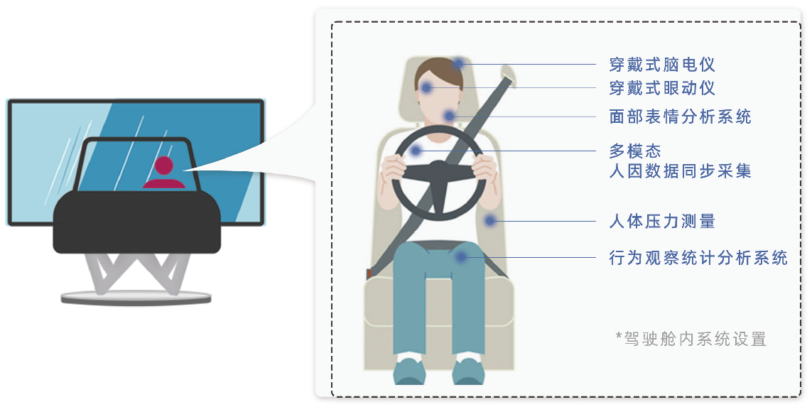 该系统集成了运动模拟舱(选配)、多通道生理信号采集分析、眼动追踪、观察行为统计分析、面部表情分析以及多模态人因数据同步采集等核心技术,能够投入高度的虚拟驾驶环境,同时连接实车交互设备,进行全面的多模态数据采集。