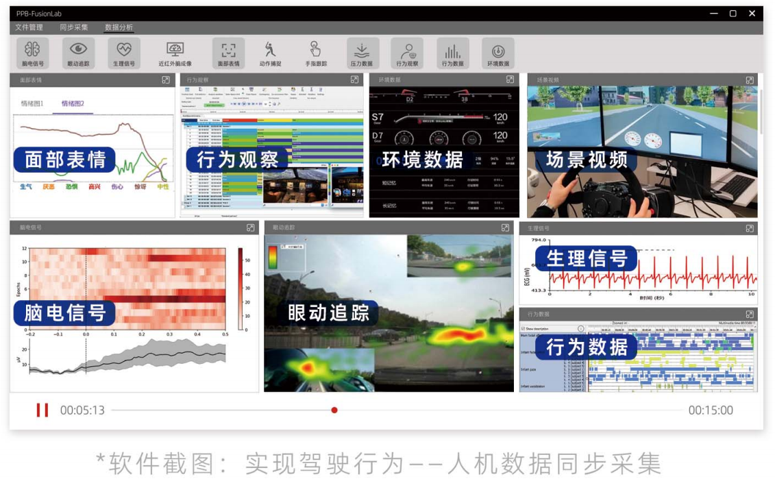 系统支持同步获取驾驶员的生理信号(如脑电、心电、皮电、脉搏)、行为数据(如眼动、面部表情、驾驶姿势)及车辆动态数据(如车速、高度、方向控制等),该平台为驾驶行为研究和人因工程应用提供了强大的数据支持和分析工具。