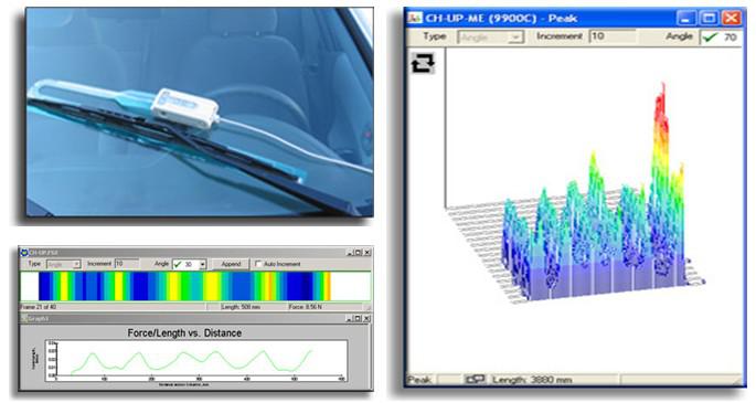 Wiper可以在多种不同的环境条件下,为您量测雨刷刮片作用于玻璃上的力量分布图形。这套系统可用于研究和开发雨刷、刮片等产品,让雨刷达到更好的效果。Wiper系统包括了USB数据撷取器、操作软件、平衡/校正装置(Model #PB5D)以及Tekscan具专利的薄型(0.004 in/0.1 mm)可弯曲感测片,可量测行驶间的动态压力分布图形,而量测的结果,则取决于汽车行驶的速度、风速,以及雨刷摆动位置等不同的条件。 设计一个真正能够有效清洁玻璃的雨刷是很不容易的,有许多的限制,如雨刷不同的长度、硬度、不均匀的压力、玻璃弯曲的弧度、复杂的机械驱动结构,以及各种不同的风压条件等,造成了在材料选择和动力设计上许多具挑战性的问题,Wiper系统能够量测整个雨刷的压力分布,提供您重要的观查力,让您了解如何改进设计,并克服上面这些复杂的问题。
