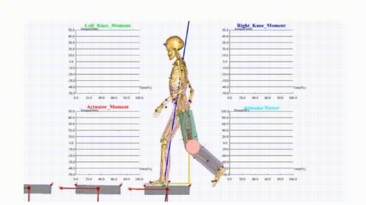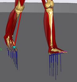 在forceplate(力板)设置困难或者无力板的场所,使用反力非常有用。在推算反力的位置,用虚拟筋的点代替接触判断用的力板。要虚拟筋和力板的距离条件,设定控制虚拟筋的活动,对包含虚拟筋的全身肌肉,进行筋活动的优化。并且,从虚拟筋发挥力量,推算反力。在推测时,设定接触判断用板块的范围和摩擦系数等。