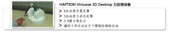 最新产品! VIRTUOSE 3D Desktop为一款3D触觉界面(3自由度力反馈和6自由度位置传感器)。该设备采用了与公司其他产品相同的软件和相同的API,同样可提供3自由度准入控制,6自由度指度等等。