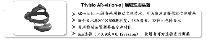 当观看者透过其他电脑运算出来的资料内容并加进现实世界的影像时,我们就称之为“增强现实”。每个人都曾有增强现实的体验,看电视时,观众透过其他虚拟物体所显示出的文字和图片资讯来观看,如∶气象新闻播报员身后的气象图背景。 本产品可以为使用者带来沉浸式的视觉体验并同时呈现3D虚拟物件。 视频追踪是视频穿透式HMD的另一项应用。AR-Vision-s具有多种功能模式,其中之一就是撷取真实场景的影像并将得到的结果在微型显示器上还原呈现。这种撷取模式可用于追踪使用者的视野。