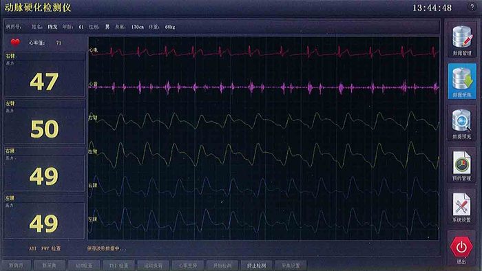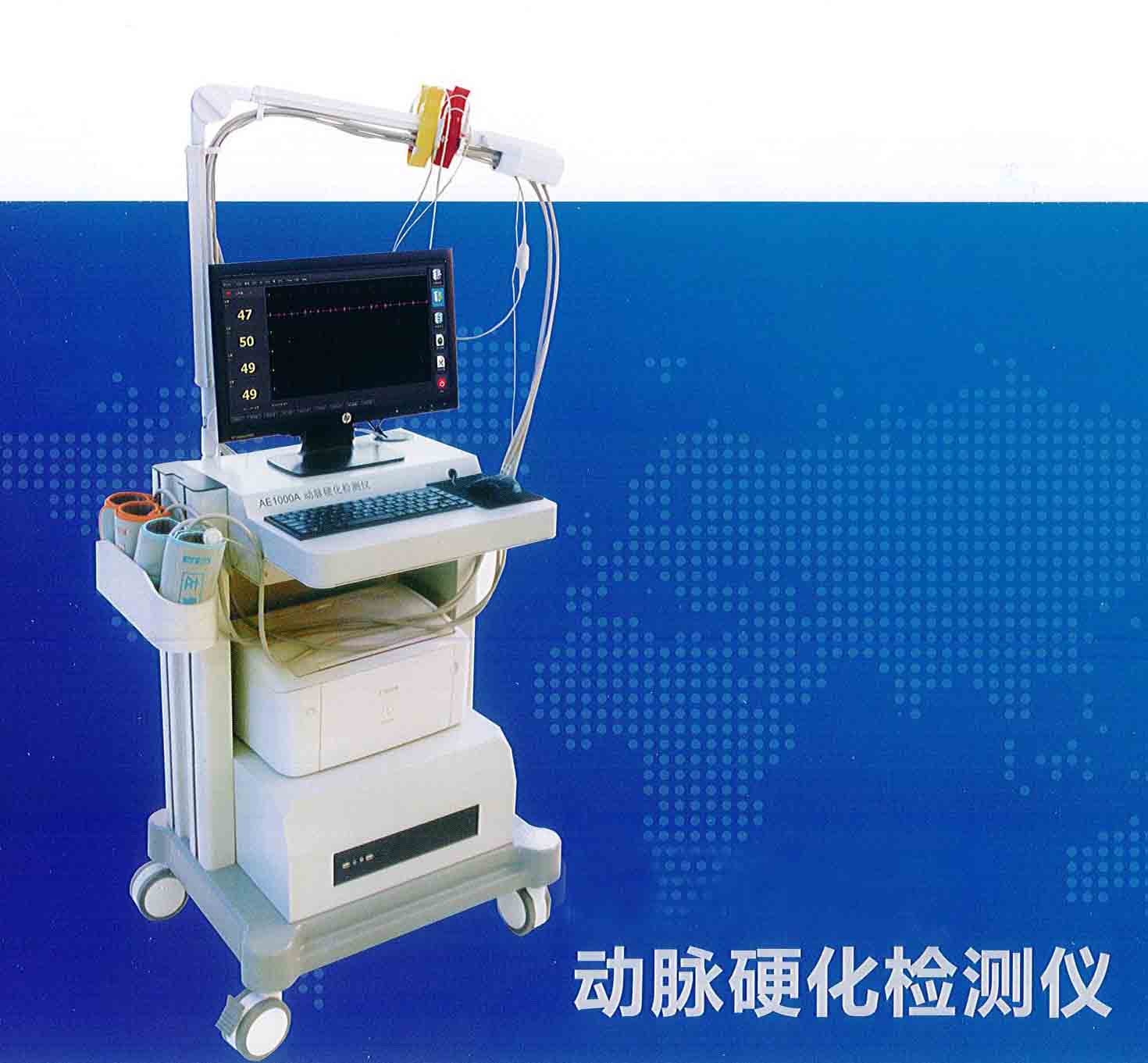 动脉硬化检测仪是一款无创血流动力学检测设备,用于人体动脉血管结构和功能病变的早期筛查。在同一心动周期内,采集心电、心音、四肢脉搏波信号,来计算脉搏波传导速度baPWV,评价血管的硬化程度;四肢同步加压,测量四肢血压,来计算踝臂指数ABI,评价下肢动脉狭窄、阻塞程度。