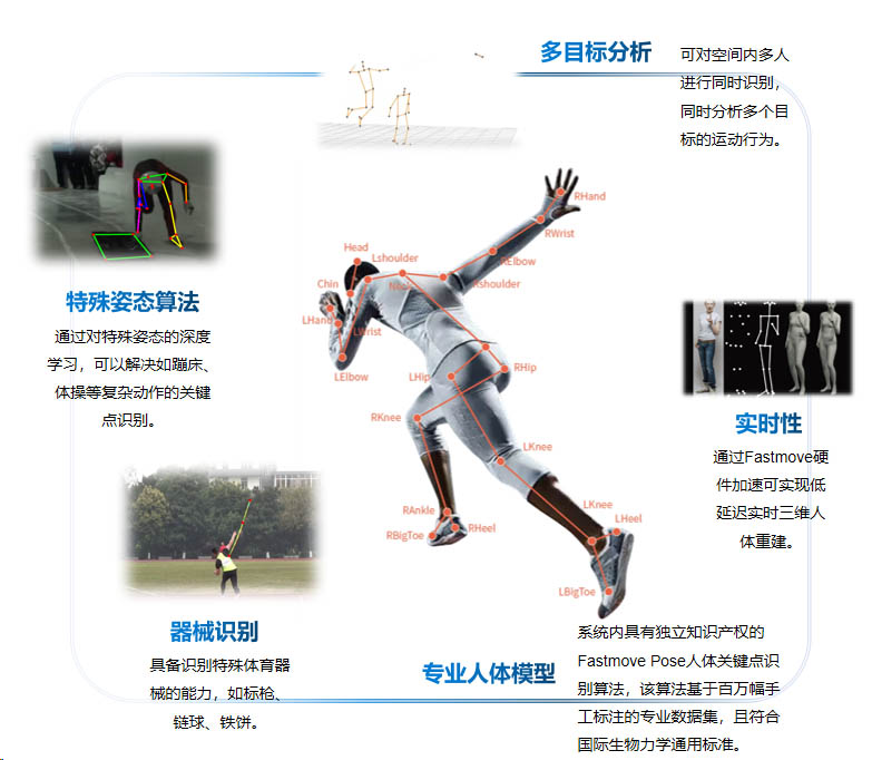Fastmove无标记动作捕捉实时反馈系统,利用基于深度学习原理的人工智能技术模拟手工解析动作技术视频过程的神经网络计算机模型,实现计算机系统对动作技术视频中人体关键点的自动识别,并进而建立起一个适用于一般生物力学研究的生物力学数据采集、处理、计算和分析的计算机系统。使用多层神经网络模型模拟了人类学习过程中大脑神经元的运作和互动方式。通过监督学习,将已经标识人体关键点的视频画面对计算机系统进行深度学习训练,模拟手工解析视频识别人体关键点的过程,使计算机系统最终获得自动识别动作技术视频中人体关键点的能力。可在不干扰和影响受试者活动的情况下,无需佩戴任何可穿戴设备或标记点对其运动动作行自动识别。为竞技体育运动员和教练员提供全面的数据分析工具,同时为体育科学研究人员提供科研级的数字化解决方案。