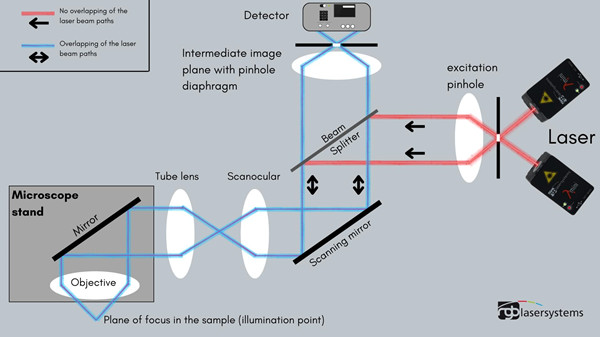 共聚焦显微镜是一种特殊的光学显微镜,可用于生成非常准确的样品图像。下图显示了这种测量的示意图体。激光束通过激发针孔或玻璃纤维发射,经显微镜架上的各种透镜到达样品。物镜将两条光束路径引向一个共同的曝光点,这意味着照明点和激发针孔同时对焦(彼此共焦)。由于荧光的作用,激光束从样品经透镜到达检测器,检测器可以从许多单独的测量结果中生成整体图像。可以想象,样品并不是作为一个整体被 “拍摄 ”下来的,而是以类似光栅的方式拍摄了许多单个图像,然后通过软件将其制作成整体图像。其工作原理是移动显微镜架,更准确地说,是在 x 和 y 方向上移动镜子,直到所有区域都拍摄完毕。例如,共聚焦显微镜可以观察到细胞或组织的高分辨率和细节。