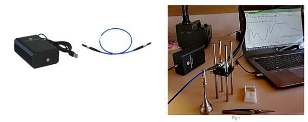 所用的光谱仪是 Thunder Optics 的 SMA-E 光谱仪。该光谱仪校准后的可见-近红外 (VIS-NIR) 光谱范围为 380 nm 至 930 nm。狭缝宽度为 100 µm,与芯径/包层直径分别为 100/125 µm 的 MMF 型多模光纤匹配。光纤跳线两端均配有标准 SMA 连接器 SMA905。光纤长度约为半米。光纤的自由端可灵活调整位置,对准被测宝石,而光纤束端则以固定位置照射宝石。将宝石放置在平坦的载体上或抓住横笛手指展开弹簧支架,两者一起固定在位。