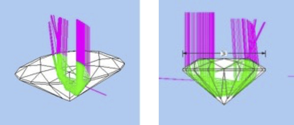 图 4、图 5 和图 6 展示了使用 GemCad程序计算的一些光线轨迹草图。模拟结果表明,这种行为取决于宝石的比例以及宝石刻面不同方向上的光线照射。