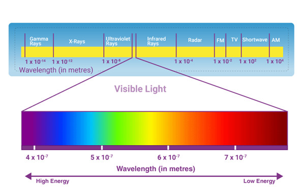 可见光谱只是人眼可见的电磁波的可观测区域。在电磁波谱中,可见光谱的范围从红外线区域到紫外线区域。可见光的波长介于红外线和紫外线之间。人眼能探测到的光谱范围从 400 纳米(紫光)到约 700 纳米(红光)。其他电磁辐射要么太小,要么太大,人眼无法捕捉,也超出了生物的极限。