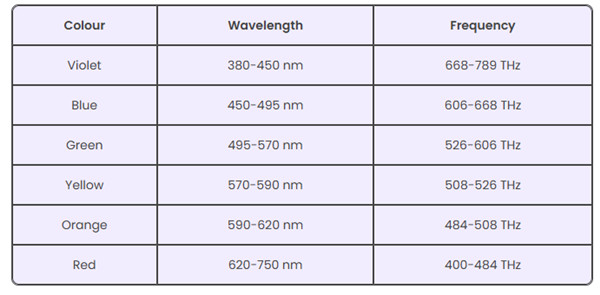 下表提供了可见光光谱中各种颜色的波长。