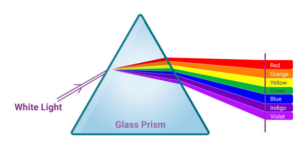 当可见光穿过棱镜时,可见光会被分离成各种颜色的光谱。红色的波长最长,为 700 纳米,紫色的波长最短,为 380 纳米。这些颜色根据波长的不同排列成彩虹色的光谱。
