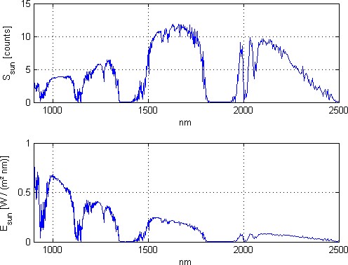 这在图中有所说明,显示了原始光谱(上)和我们系统测量到的太阳绝对辐照度光谱。