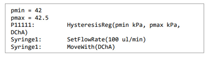 确定所需压力后,即可使用 uProcess 中的迟滞功能创建具有恒定流量的压力驱动流量控制器。迟滞功能可将压力保持在设定范围内。如果压力低于调节范围,uProcess 将调节至较高压力 (pmax),并让压力下降至较低压力 (pmin)。参见图 3 的直观说明。