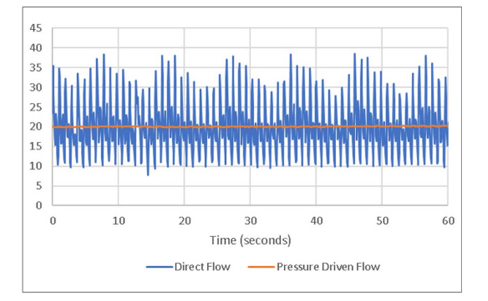 图 5 显示了本应用中 SPS01 直接流动与压力驱动流动的流量曲线。压力驱动方法消除了直接(正排量)方法中观察到的脉动。