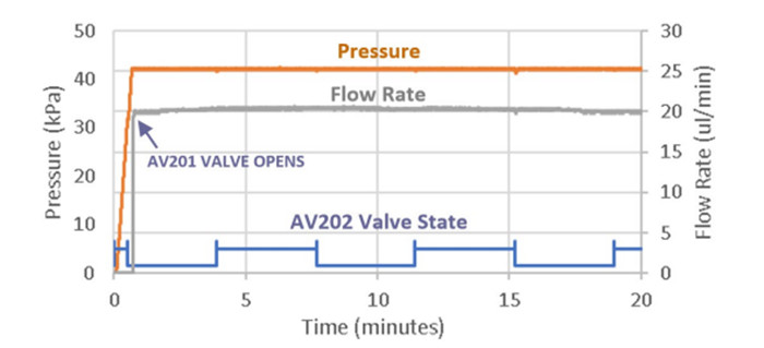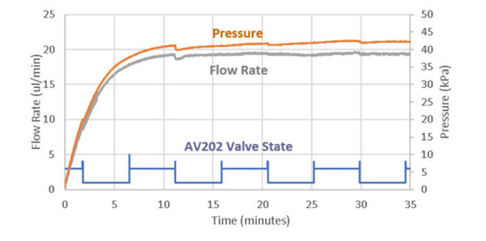 图 2 显示了设定流速为 20 ul/min 时产生的下游流速和储液罐压力。压力和流速逐渐增加,直至达到稳定压力,在本例中为 42 kPa。流速传感器的数据验证了稳定流速与设定流速 20 ul/min 相对应。