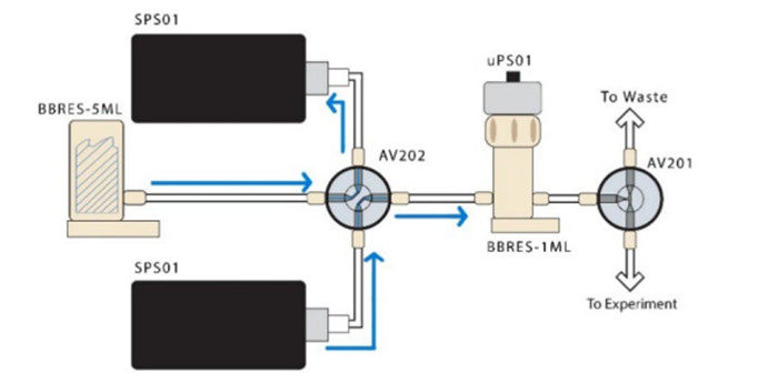 储液器下游的 AV201(三通)阀用于在初始加压期间停止流动。一段 1 米长的毛细管可用于模拟微流控芯片或其他设备的背压。