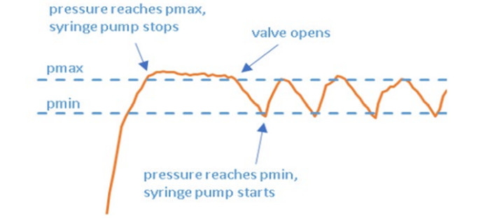 两个注射泵按设定程序交替以所需流速流动(一个泵流动,另一个泵填充),直至达到稳定的压力。根据实验条件,这可能需要最多 30 分钟。