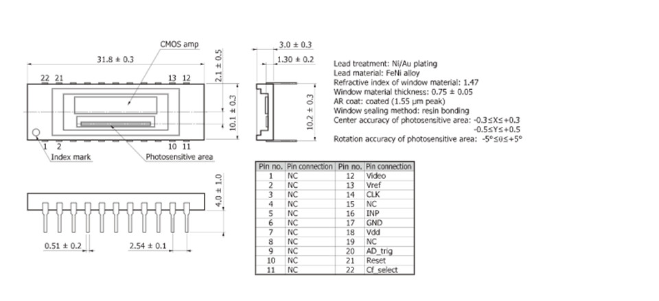 G9203-256DA是一种InGaAs线性图像传感器,设计用于光通信中的WDM监控探测器。该线性图像传感器包含CMOS电荷放大器阵列、CDS电路、偏移补偿电路、移位寄存器和定时发生器以及InGaAs光电二极管阵列,并在近红外范围内提供高灵敏度和稳定的操作。该封装被气密密封以获得高可靠性,并且光输入窗口具有抗反射涂层以提高光检测效率。CMOS芯片上的信号处理电路允许通过外部电压选择两个转换效率(CE)。当图像传感器在CE=16nV/e-下操作时,可以获得宽的动态范围,而在CE=320nV/e--下可以获得高增益。