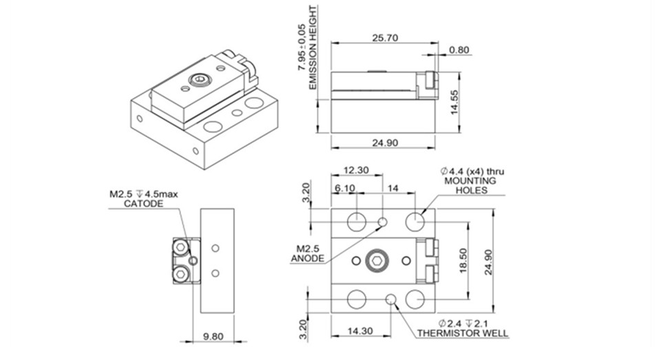 Monocrom的CS-mount-808-nm是一种波长为780至830 nm、输出功率为20至500 W、工作电流20至450 A。Monocrom的夹紧技术与我们的二极管激光支架中毫米尺寸冷却通道的使用相结合,使激光头非常坚固可靠,适合工业环境,维护要求低。