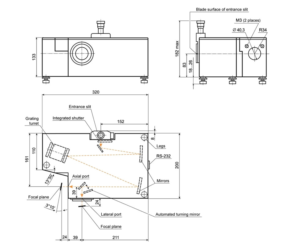 MS200 - 全自动紧凑型成像单色仪-摄谱仪,焦距为 200 mm,在其他 MS 系列设备中具有F/number 3.6。MS200 设备性能参数优异,尺寸小巧,既可作为独立的光谱设备使用,也可作为光谱系统的一部分。它们是同时测量光谱范围内不同波长的好选择。MS200 是 MS 系列中一款两个输出端口成直角的仪器。这在某些应用中很重要,例如在进行偏振测量时。高质量的光学器件和多种衍射光栅可供选择,使设备可在 185 nm 到 60 µm 的宽范围内工作(取决于所选光栅)。MS2001i 和 MS2004i 型具有散光校正光学器件,因此可用于多通道光谱分析。MS2001 和 MS2001i 两种型号都采用了便于手动切换光栅的单位置支架。有多种可更换光栅可供选择,从而在不同光谱区域实现高能量效率和光谱分辨率的好组合。自动四光栅转塔(MS2004 和 MS2004i 型)可快速切换光栅,并对设定波长具有很高的重复性。MS200 系列单色仪光谱仪有一个输入端口和两个输出端口。输出端口的安装可通过自动反射镜实现。每个输出端口可安装输出光谱狭缝或多通道探测器。我们提供的 MS200 系列单色仪摄谱仪有两种类型的输入和输出光谱狭缝:手动(用千分尺螺钉操作)和自动(组合)(狭缝宽度可自动或手动操作(用千分尺))。