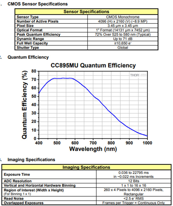 本相机具有一个黑白2/3英寸制式的CMOS传感器,传感器的大致位置与相机外壳的四个侧面上的前侧1/4"-20安装孔对齐。相机前端的可拆卸C-mount转接件可夹持一个透明保护窗口片,保护窗口片镀有用于400-700 nm范围的增透膜,窗口片可用厚为0.079英寸(2.0 mm)的Ø1英寸(Ø25 mm)光学元件代替。请注意,拆卸透明窗口片时,灰尘和碎屑可能会积聚在密封室的玻璃盖上。清洁盖子时须小心,以免刮伤或损坏玻璃。