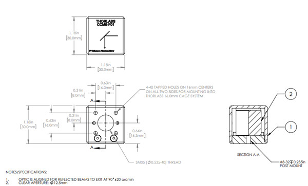 CCM5立方体底部带有8-32螺孔或M4螺孔,分别可用于英制组件或公制组件。这些立方体的入口和出口有SM05螺纹(0.535英寸-40)和4-40螺孔,分别可连接我们的SM05透镜套筒和Ø4 mm笼杆。已安装转向镜可使用笼杆和SRSCA转接件连接其它笼式立方。