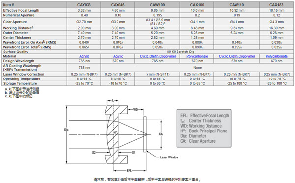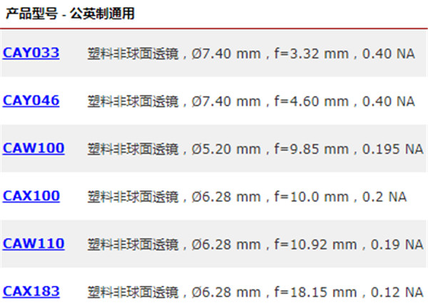 塑料非球面透镜可选未镀膜和400 - 700 nm增透膜,它们是使用模压技术生产的全塑料、近衍射极限的光学元件。这些光学元件由飞利浦设计,以低价用于大批量应用,是要求轻质组件的低功率应用的理想选择。非球面透镜设计用于消除球差,使单色光束的聚焦光斑和准直达到近似衍射极限。我们所有的塑料非球面透镜都可单个出售。对于精选的透镜,我们也提供25片、50片和100片的套装系列,分别比单片出售的价格低16%、33%和50%。