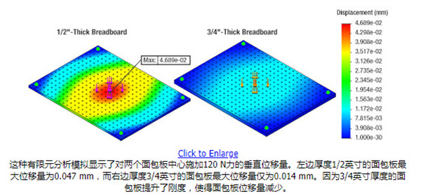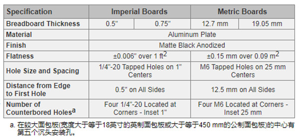 每块面包板都有偏移错开1/4"-20(M6)螺纹孔阵列的四个或五个安装孔,这样不会对客户预想应用的安装表面造成影响。四个标准安装孔位于面包板的四个角,距离各边边缘1英寸(公制25mm)。较大的英制和公制面包板(宽度大于等于18英寸的英制面包板或大于等于450 mm的公制面包板)在中心还有第五个沉头安装孔。中心安装孔能够增加安装选项,减小边缘安装孔的应力并在安装重负载时增加刚性。面包板通过安装孔连接到各种表面以及安装座,包括光学平台、其它面包板、安装接杆或支架。