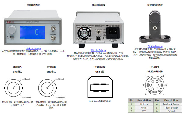 MC2000B斩波器设计特色是一个高质量、稀土磁体直流电机。光刻光学斩波轮的叶片由厚度为0.01英寸的蓝色时钟弹簧钢制造,具有高精度。斩波器结构紧凑,使用宽底座提高稳定性,底座中有两个凹槽,中心间距是3英寸(76.2 mm),可以使用两个1/4"-20(M6)螺丝安装。安装凹槽的半径为1.5英寸(38.1 mm)。为方便设置,接口电缆使用圆形卡入式Hirose接头。