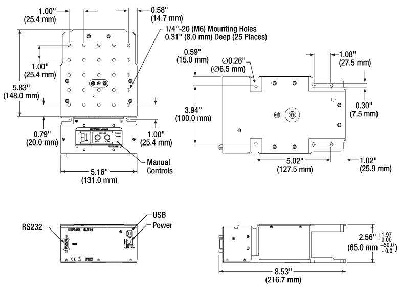 MLJ150(/M) 5.83英寸 x 5.16英寸(148 mm x 131 mm)的顶部平台上有二十五个1/4"-20(M6) 安装孔。此处还可以看到用于手动控制的键盘。