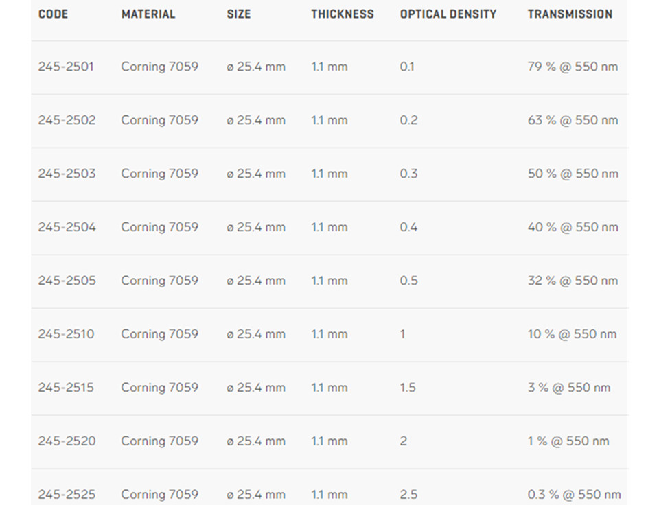 中性密度 (ND) 反射型滤光片的尺寸为 1''(25.4 毫米),光密度从 0.1 到 2.5 不等。