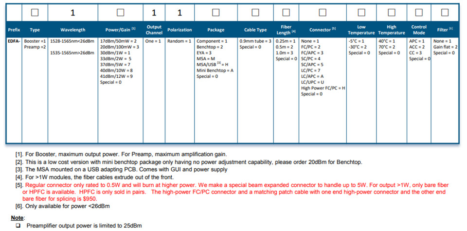 对于长周期脉冲应用,还可提供特殊 EDFA。对于功率小于 26 dBm 的 EDFA,可以添加增益平坦滤波器。