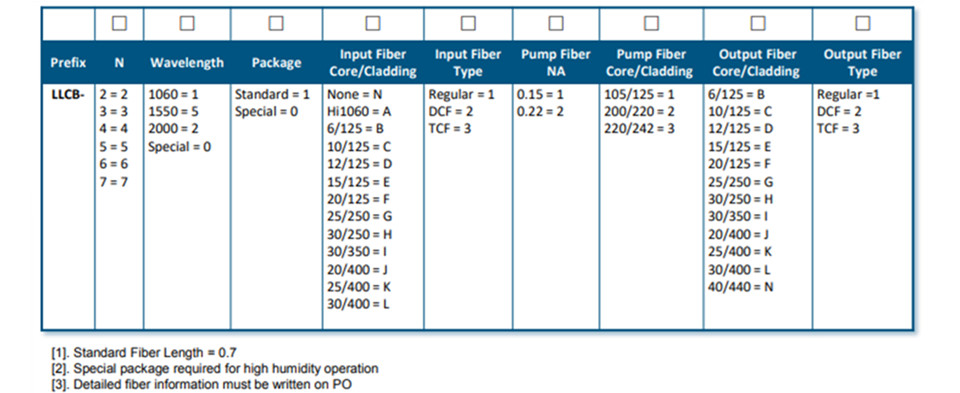 LLCB 系列 (N+1)x1 光纤合路器专为高功率光纤激光器应用而设计。它们将 N 个泵浦激光器和一个信号通道组合到一根激光光纤中。其技术是利用型号直径差异进行渐变。耦合器在分光时效率很高,损耗很小,每个接头约 0.2dB,但在合光时损耗很大;例如,50/50 耦合器在合光时,每束光的损耗为 50%。