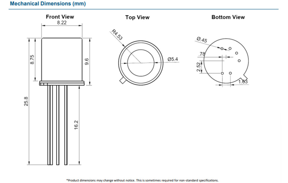CPOD 系列硒化铅探测器(PbSs)具有更高的灵敏度,可探测 2-5 µm 范围内的中红外光。这些探测器是密封的,以确保低泄漏。探测器封装内集成了一个热电冷却器和一个 MEMS 斩波器,在保持紧凑外形的同时大大降低了背景噪声。此外,为方便使用,还提供了带放大器的驱动 PCB。