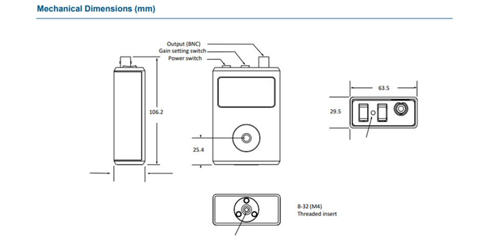该器件由标准 9V 或外置低噪声电源供电(可购买)。底部有一个 M4 安装螺纹。