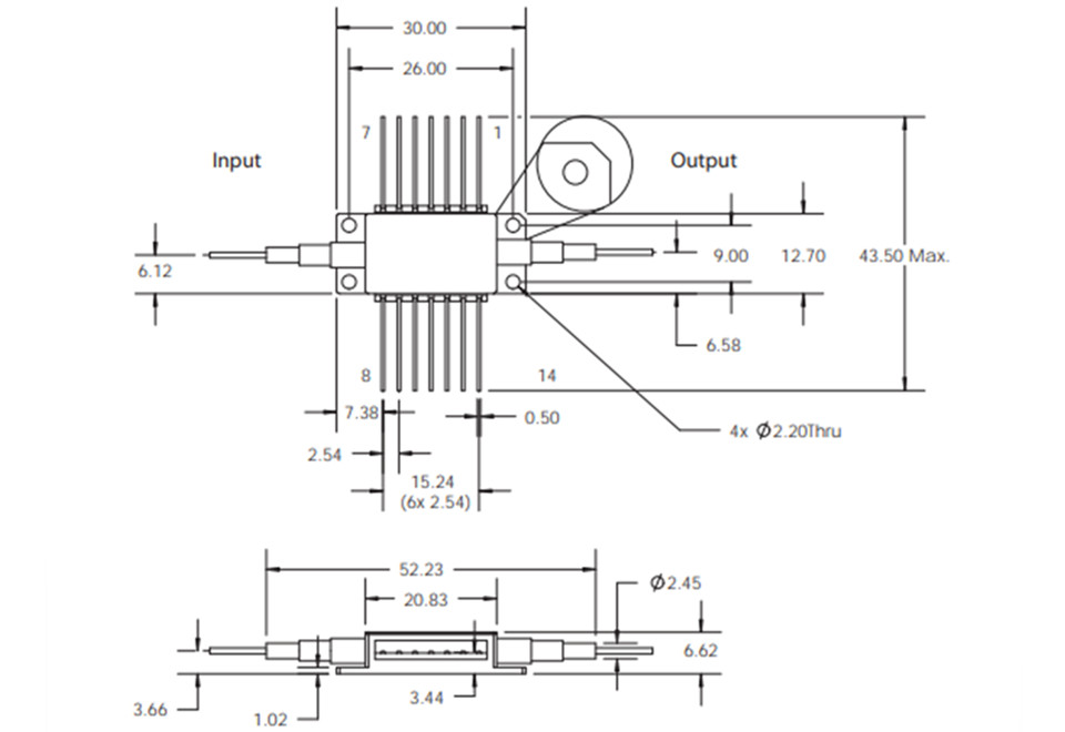放大器采用符合 MSA 标准的 14 引脚黄铜封装,基于 Aeon 标准封装平台。采用激光焊接、密封、无有机物封装,可确保高度可靠的运行。该封装集成了热敏电阻和热电冷却器,可使 SOA 在整个工作温度范围内稳定工作。Aeon 提供各种 SOA,支持的波长范围从 1000nm 到 1600nm,增益选项从 5 到 30 dB 不等,我们还可以优化参数,以满足您的特定应用需求。
