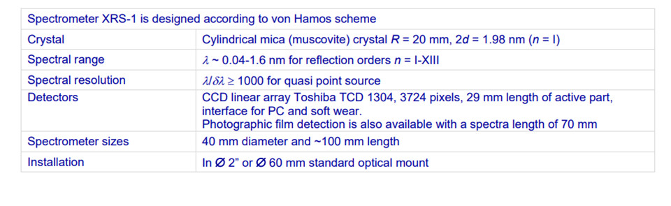 Crystal techno Ltd. 生产用于 X 射线和真空紫外 (VUV) 光谱范围(波长~ 0.4-100 nm)的光谱测量的光谱仪。聚焦圆柱形晶体(X 射线范围)和球形衍射光栅(VUV 范围)在光谱仪中用作色散元件。设计的一些特点是紧凑、高亮度(效率)、调整和对准简单。这些光谱仪的独特品质是其绝对校准的可能性,允许提供各种等离子体源的计量和完整诊断:激光产生的等离子体,包括飞秒激光产生的等离子体,z-pinch 等离子体,包括高功率 Z-pinch 等离子体,毛细管放电等离子体,用于纳米光刻的 EUV 源。这些设备还可以成功地用于荧光和结构分析、吸收和 EXAFS 光谱。