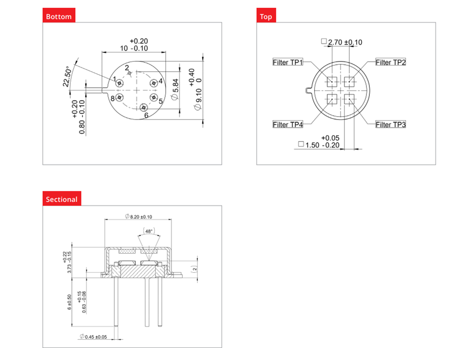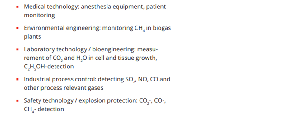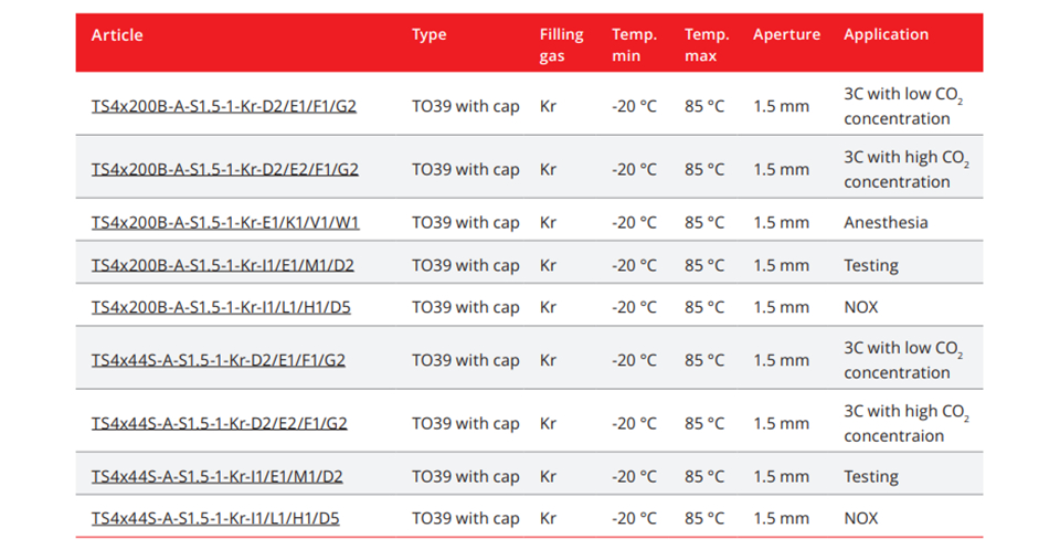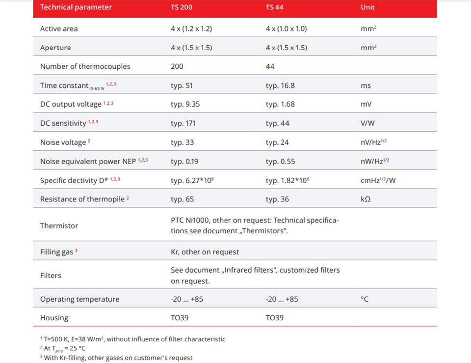 热电堆探测器的信号强度可与高温探测器相媲美:高达 6.27*108 cmHz1/2/W 的高探测率和高达 171 V/W 的高灵敏度,填充气体氪。干涉吸收器、用于参考温度测定的集成热敏电阻和参考通道(CWL:5060 ± 25,HBW:100 ± 15 nm)是在苛刻应用中长期使用的进一步重要产品特性。