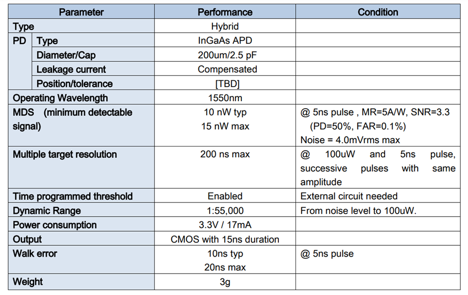 WDR110 LRF(激光测距仪)接收器发布用于激光测距和测量。InGaAs APD 提供眼睛安全和高灵敏度。推出 CMOS IC 以实现更复杂的性能和紧凑性。单个 FR4 PCB 和标准 TO-8 封装为激光雷达接收器提供了一种低成本的解决方案。