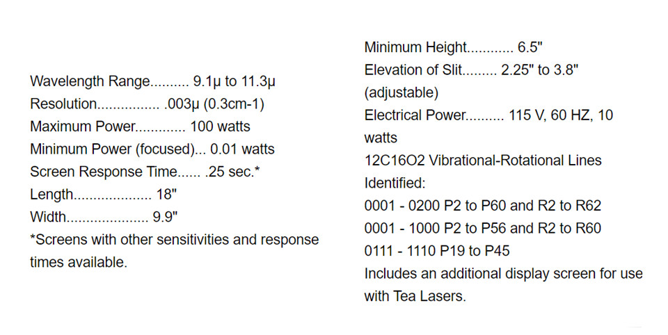 CO2 光谱分析仪是一款独特的光栅光谱仪,可同时显示 CO2 激光器的所有激光处理。它在波长和旋转线指定方面都经过校准,可以轻松识别 9.1 和 11.3 µ 之间的 140 种可能的激光跃迁。这些转变通过使用紫外激发的热敏屏幕直观地显示出来,该屏幕在红外激光束照射的区域变暗。