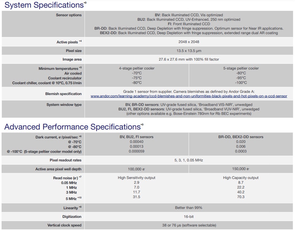Andor 的 iKon-L 936 的设计考虑了科学成像。2048 x 2048 阵列和 13.5 μm 像素间距相结合,可提供 27.6 x 27.6 mm 的有效图像区域,TE 冷却至 -100°C。 iKon-L 提供好的分辨率、视场、灵敏度和动态范围性能。通过将 > 90% 的 QE(背照式传感器)、低噪声读出电子设备和超深 TE 冷却相结合,实现了高灵敏度性能。