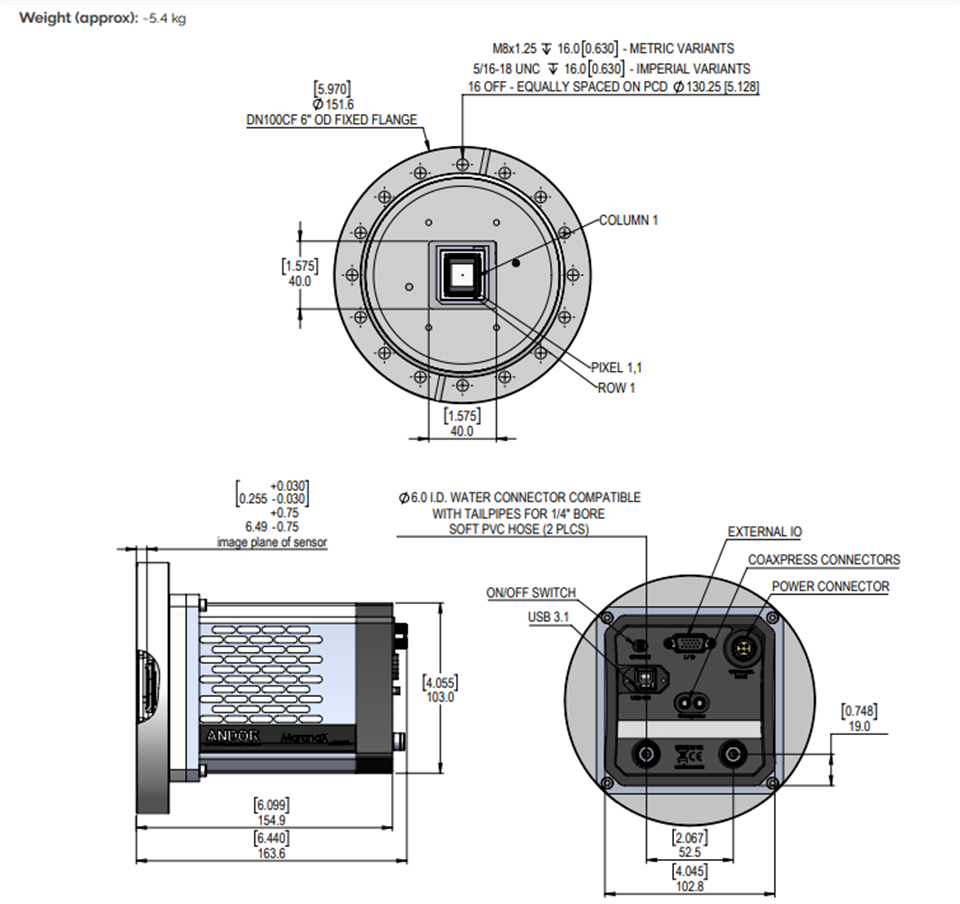 安装法兰:DN100CF (ConFlat) 6” O.D.固定法兰提供 M8 或 5/16 UNC 螺纹孔