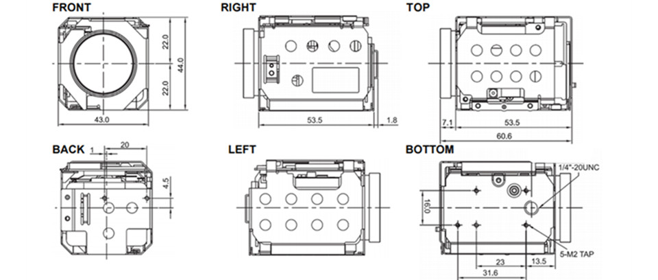 Harrier 10倍自动对焦变焦SDI摄像机的尺寸仅为62.4 x 43 x 44毫米(长 x 宽 x 高),重量仅为112克。它提供高达1080p60的全高清视频输出。其先进的功能包括实时真宽动态范围(WDR)、日夜模式 - 红外截止滤光片移除(ICR)、数字降噪(2D + 3D DNR)和数字图像稳定功能。该摄像机可通过 VISCA 协议串行通信或 Pelco – D/P 控制协议进行控制。